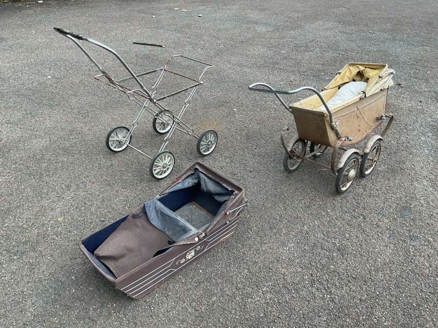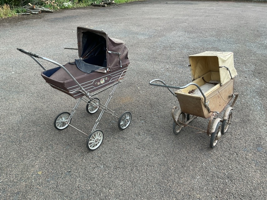 A 60s dolls pram with removable fabric upholstered carrycot body with folding hood on a folding chromed frame; and a 30s dolls pram with folding hood, metal boat shaped body, strap suspension and spoked wheels with mudguards. (2)