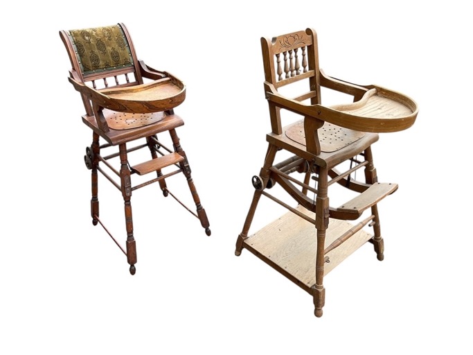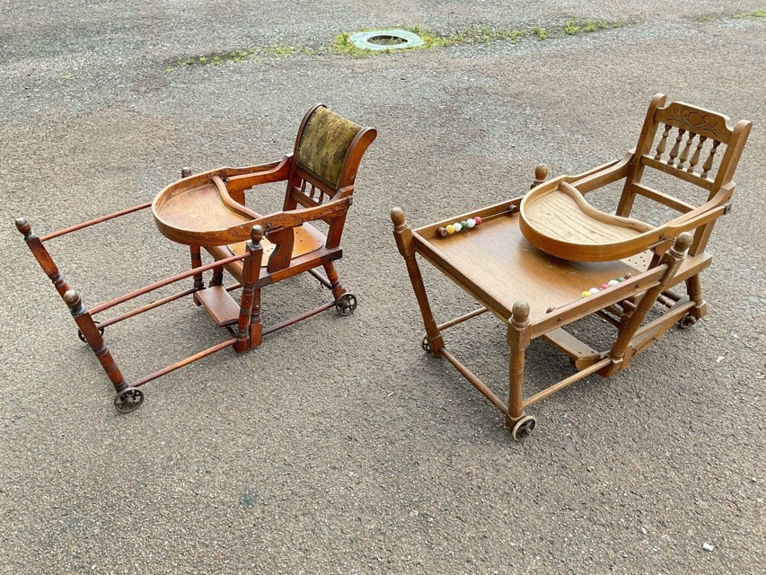 An Edwardian beech metamorphic high chair with upholstered back, hinged tray and pierced seat raised on turned legs, folding to a cast iron wheeled low chair; and another similar in oak with carved spindled back, converting to a table with ceramic play beads. (2)