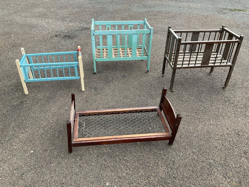 A 60s painted wood dolls cot with pig motif and rod of play beads; a hand-made dolls bed with arched head & footboards and wire mesh base; and two 30s cots with slatted bases and rise-and-fall sides, raised on square legs with castors. (4)