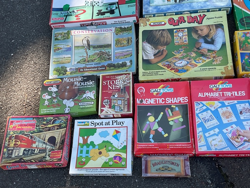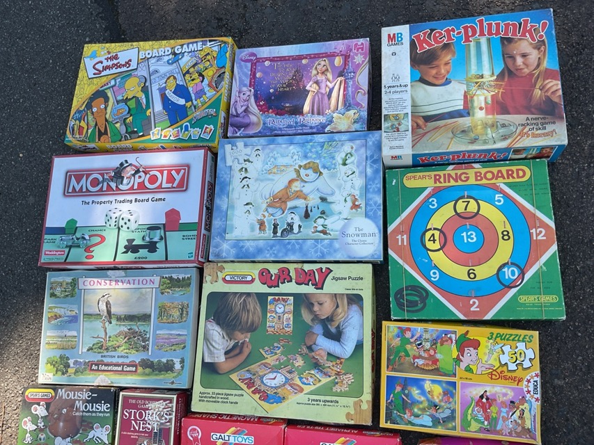 A collection of boxed jigsaws and games including Kerplunk, Monopoly, Mousie-Mousie, The Simpsons board game, jigsaws, The Snowman, Spot, Disneys Rapunzel and Peter Pan, etc. (17)