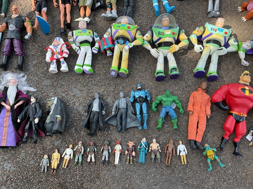 A collection of posable action figures from TV, movies, cartoons, etc., including Dr Who Daleks, Cyberman, Action Man, Buzz Lightyear, the Incredibles, King Kong, Thunderbirds, Captain Scarlet, Lord of the Rings, Harry Potter, Sin City, etc. (A lot)