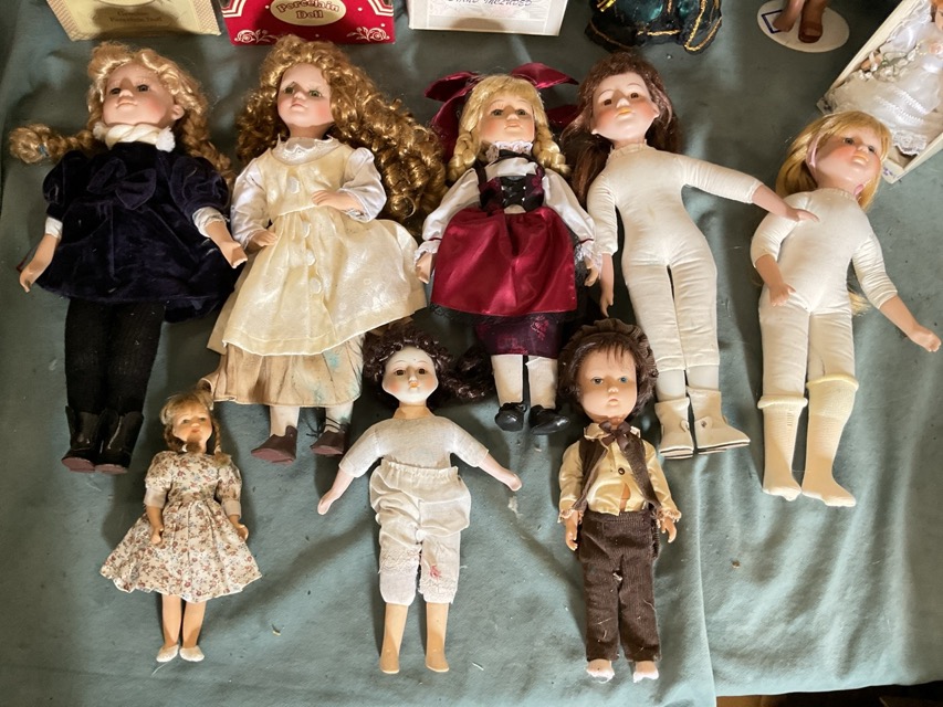 A collection of porcelain dolls - three boxed girl dolls, a boxed bride doll, boys and girls dressed dolls, and three undressed examples. (12)