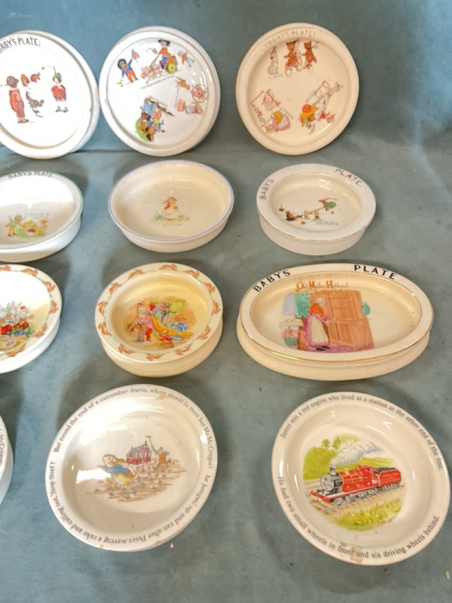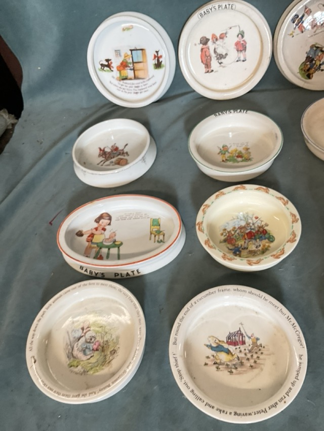 A collection of Edwardian and later babies plates including Wedgwood Beatrix Potter and a Thomas the Tank Engine, Royal Doulton Bunnykins, others decorated with nursery rhymes by Shelley, Burleigh, Carlton Ware, Losol, etc. (16)