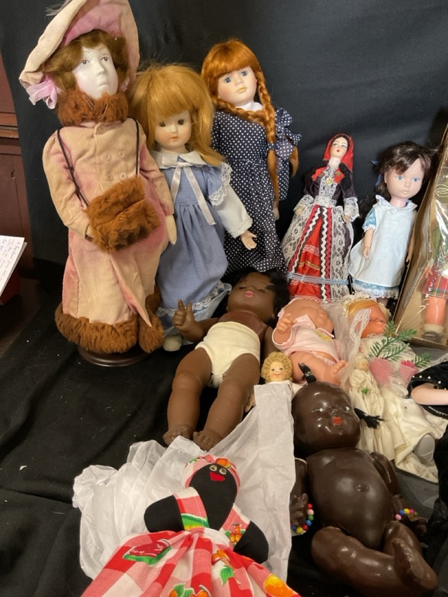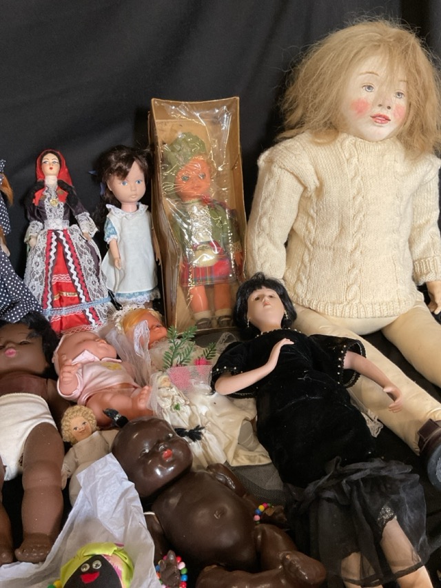 Miscellaneous dolls - a Scotsman, babies, a composition African American Topsy doll, porcelain display figures, brides, a clothes peg doll, a Caribbean reversible lady, etc. (15)