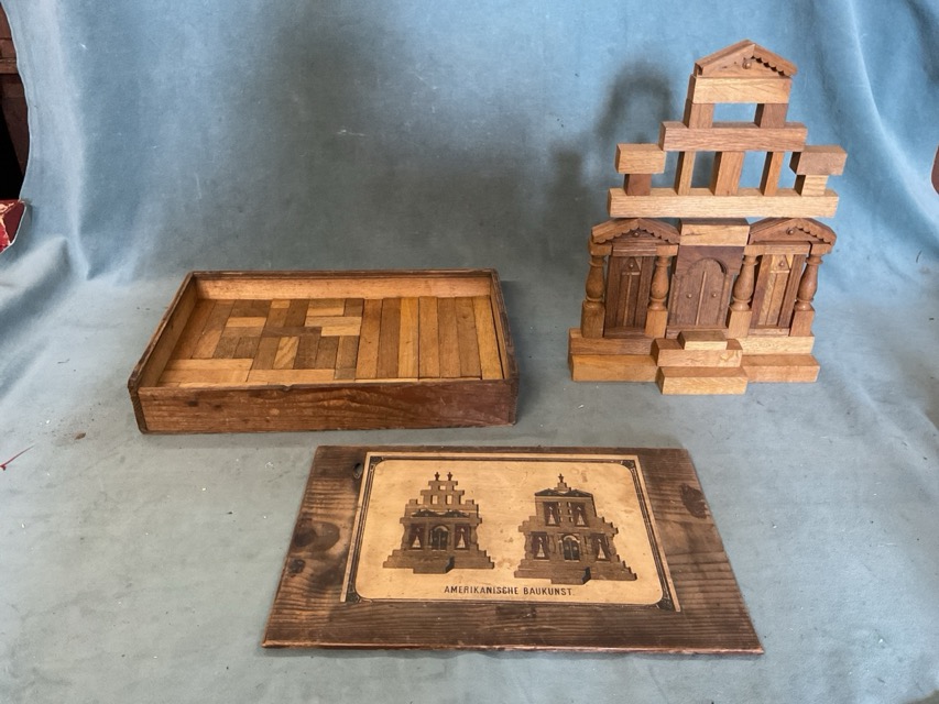 A dolls house with period style interior; and a German made building blocks kit with design elements influenced by American architecture. (2)