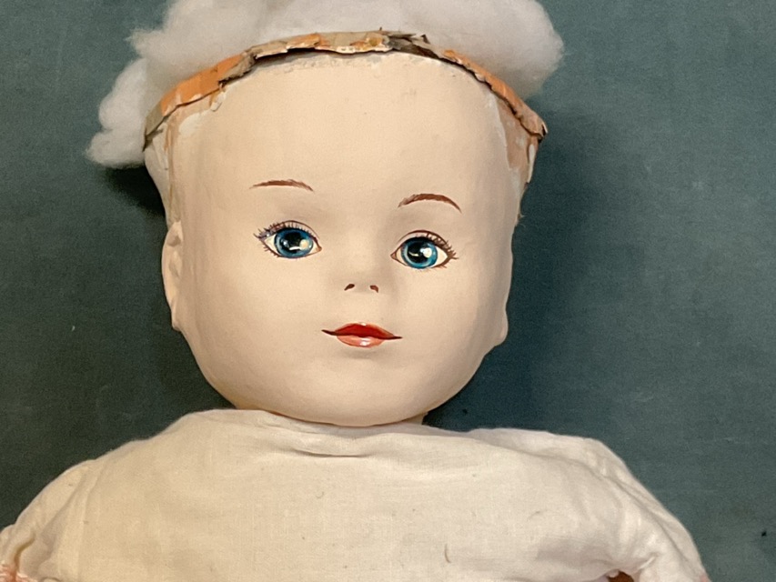 An uncompleted antique style doll with cloth body, legs and arms, handpainted composition head and forearms, wig, an edwardian muslin dress, hat, sash and petticoat; and a replica cotton petticoat and drawers. (A lot)