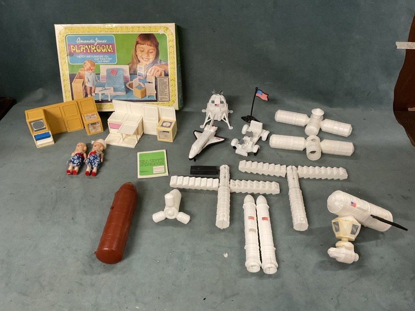A collection of modern toys including a Boxed Fireman Sam fire station, a Disney castle, a model farmhouse, animals, accessories and cottage, a Polly Pocket modular house, Fifi and the Flowerpots, a modular space station and astronauts, clip-together dolls furniture, etc. (A lot)