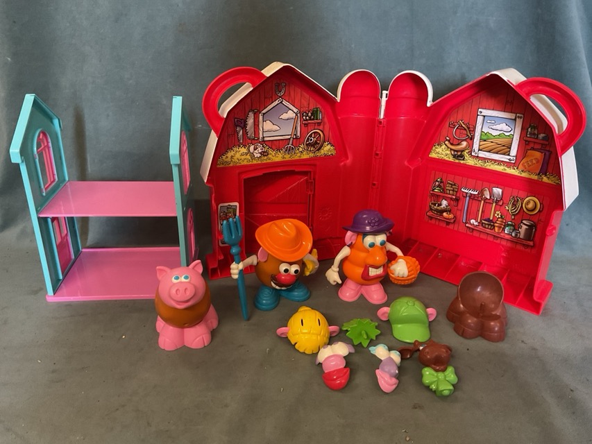 A Mr potato-head farm with three figurines having interchangeable limbs and accessories; a two story dollhouse with pink & blue exterior; and a Keenway foldout house with furnishing and dolls. (3)