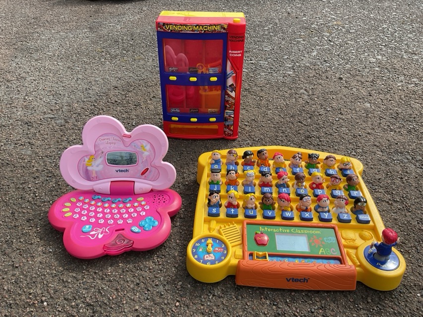 Miscellaneous battery operated toys - a boxed remote control go-kart, a speedboat by Platwell, a My Pal 2 talking robot, a Poo-Chi robotic dog by Sega, cars, A Vtech laptop & interactive classroom, a Star Wars pinball, clocks, Thomas the Tank Engine, a insecto bot by MGA entertainment, Rubiks cubes, gimmick toys, a water pistol, a Thunderbirds rocket ship, videos, etc. (35)