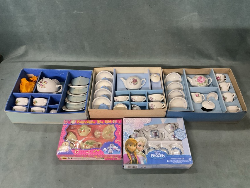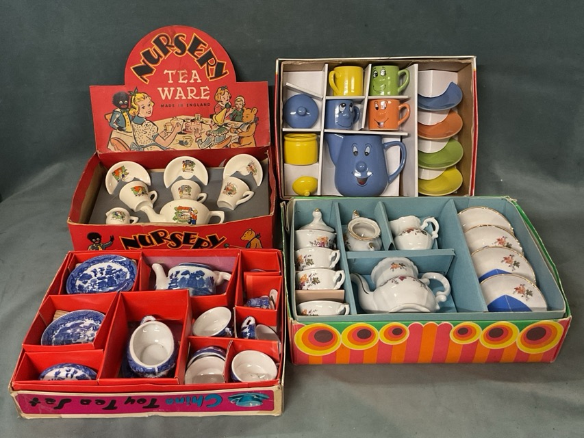 A collection of childrens teasets - 50s nursery rhymes, 60s willow pattern, 70s floral sets, a Simba set with cartoon happy face motifs, five boxed dolls teasets - Disney Frozen, another with strawberry motifs, floral decorated, etc. (9)