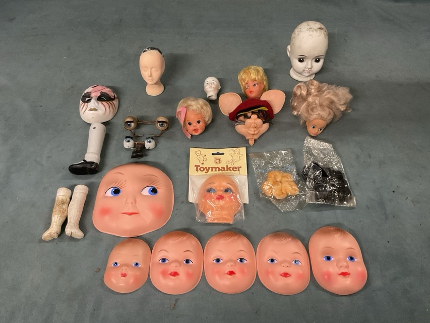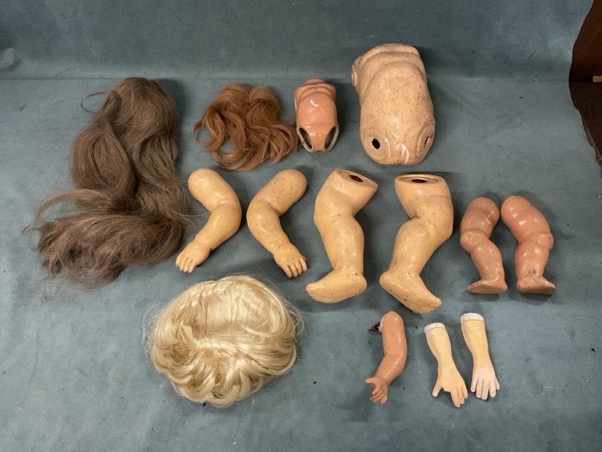 Miscellaneous doll components - composition bodies and limbs, unused celluloid rag doll faces, small porcelain heads, a sleeping eyes mechanism, wigs, etc. (A lot)