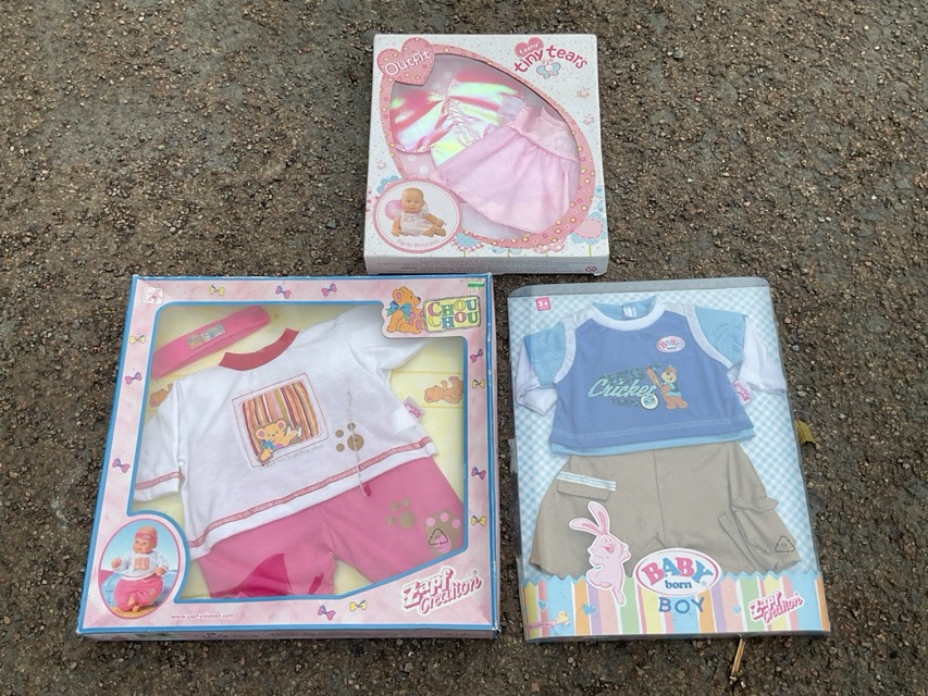 Miscellaneous dolls accessories including a boxed Monster High Premiere Party set, baby doll bathing & feeding toys, parasols, boxed Chou-Chou, Zapf Baby Born, Tiny Tears outfits, dolls fashion accessories and handbags, etc. (A lot)