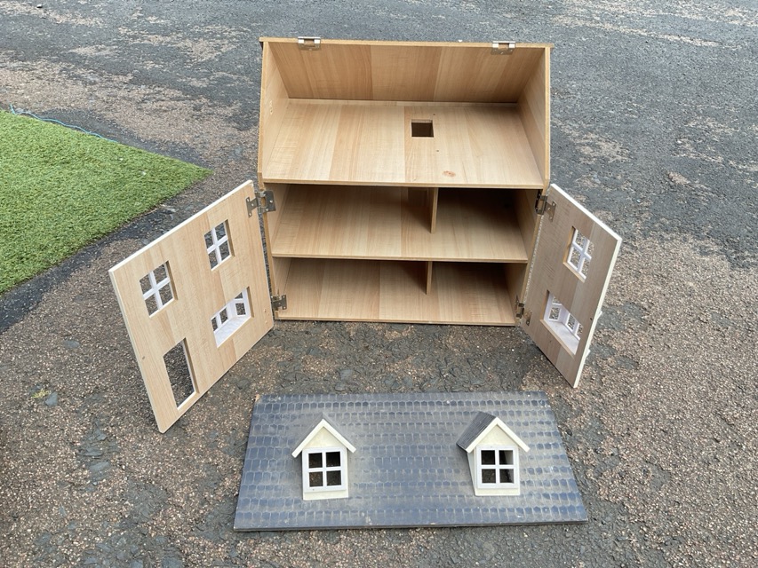 A contemporary dolls house, with faux slate roof and bay windows, with a collection of pine dolls furnishings, stairs, chairs, beds, etc. (A lot)