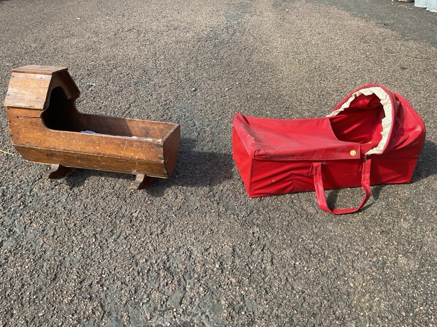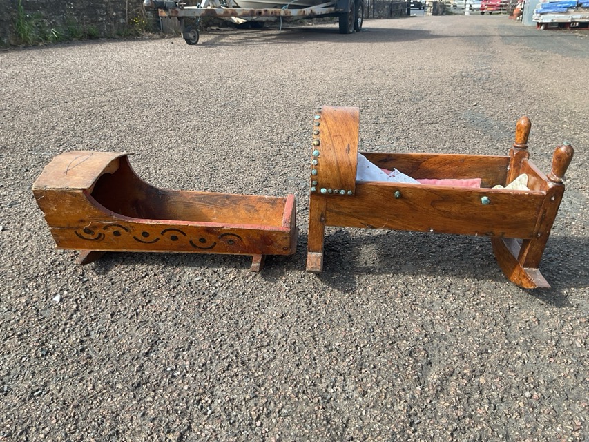 Three scratch built dolls cradles, raised on shaped rockers - old & painted, brass studded and chamfered; and a faux leather Luxiproduct crib with carriage handles. (4)