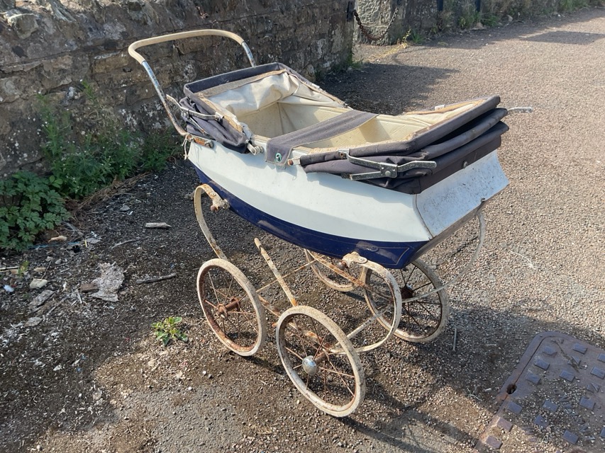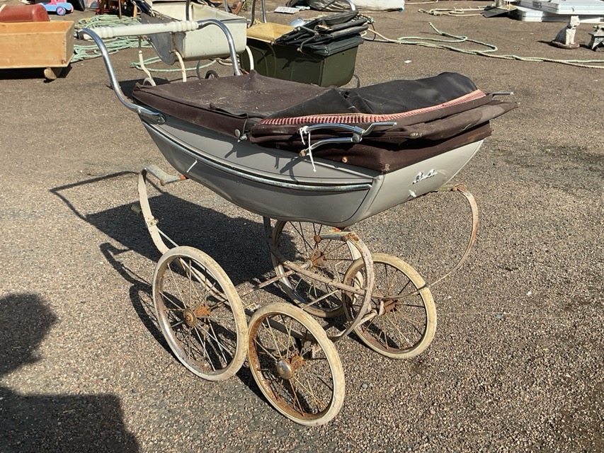 A Silver Cross perambulator with brown canvas cover, raised on metal frame with spoked wheels; and a similar style dolls pram with twin canopied carriage and padded lining. (2)