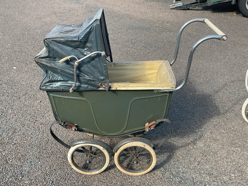A Victorian style dolls pram with lined interior and concertina canopy, the green enamelled tub shaped body having leather strap suspension; and a Tri-ang pram of serpentine form, with lined interior, raised on chromed wheels. (2)