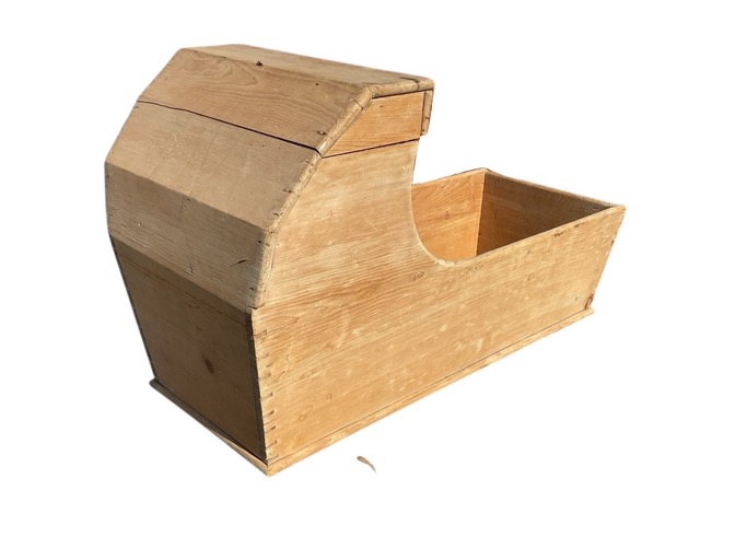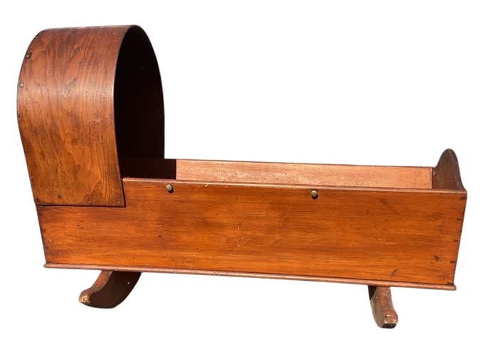 A pine childs cradle, with arched head board with dovetailed body, raised on rockers; and another pine cradle with panelled cover, raised on scroll carved rockers. (2)