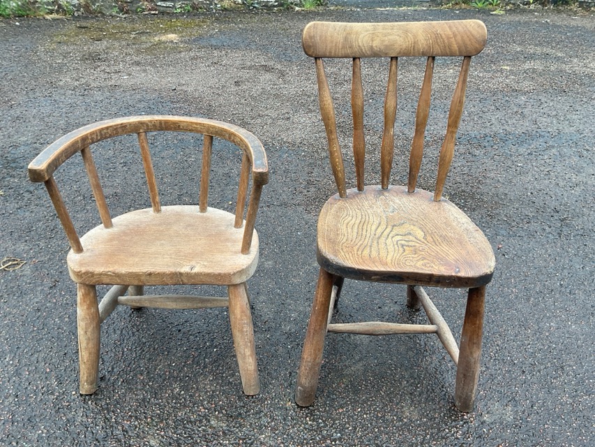 Three childs chairs - a horseshoe captains style, a victorian potty chair, and an oak spindleback. (3)