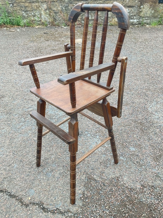 A C20th dolls highchair with arched spindleback above square seat, raised on turned legs; and a Lloyd loom style childs chair with square back and seat raised on legs with brass caps. (2)