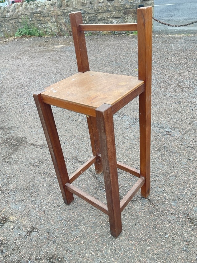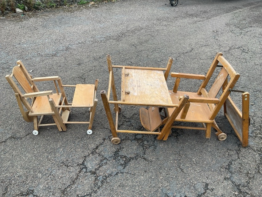 A childs metamorphic beech highchair by Atcraft, converting to a wheeled play table; a similar dolls convertible chair; and a scratch built tall dolls stool. (3)