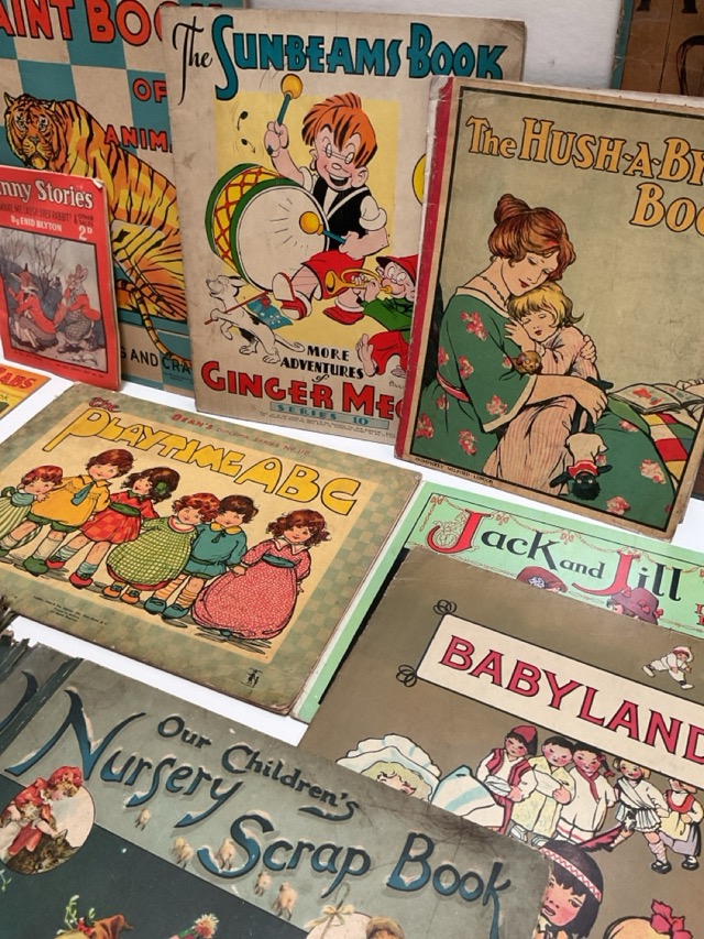 An Edwardian cotton scrapbook with cutouts of Queen Victoria, advertisements, fashion plates, Grave Darling, flowers, animals, etc.; and a collection of childrens books - Hush-a-Bye, Jack & Jill, Babyland, Betty & Babs, etc. (13)