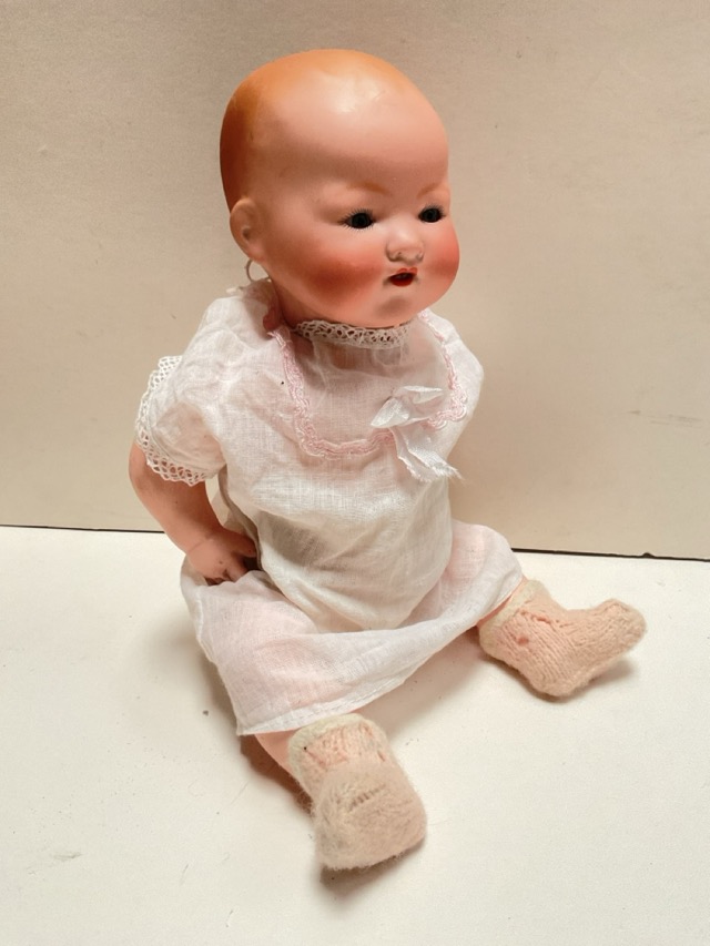 An early C20th Armand Marseille doll, model 370, having porcelain head, shoulders & hands, with articulated cloth body; and an Armand Marseille porcelain babydoll, the 351 model with articulated arms & legs and sleep eyes. (2)