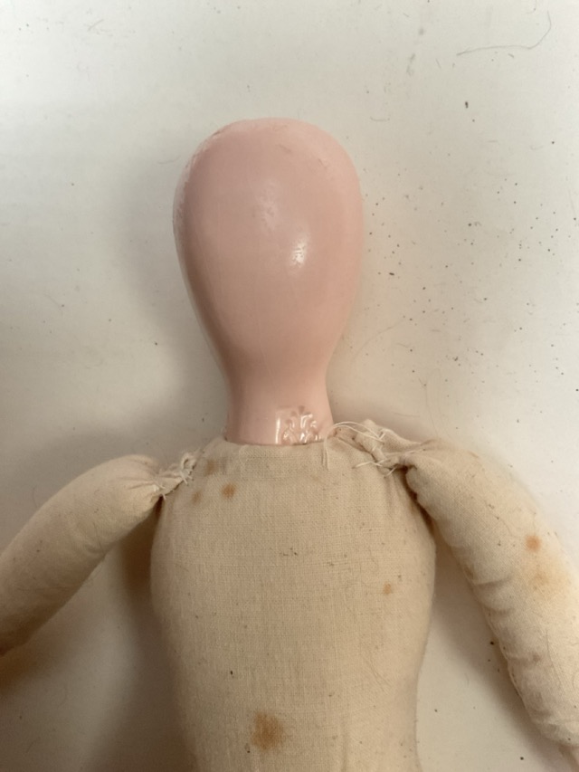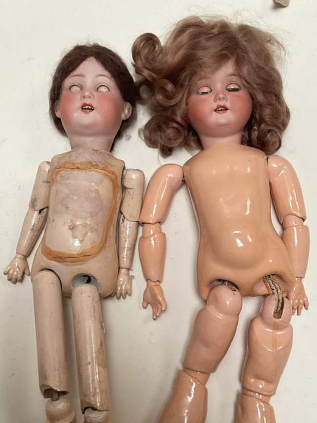 A German Mengersgereuth Porzellanfabrik, porcelain head & composition body having wood limbs, stamped PM 22; a Schoenhut & Hoffmeister porcelain head doll; and a C20th cloth bodied doll with porcelain head and limbs - stamped to neck. (3)
