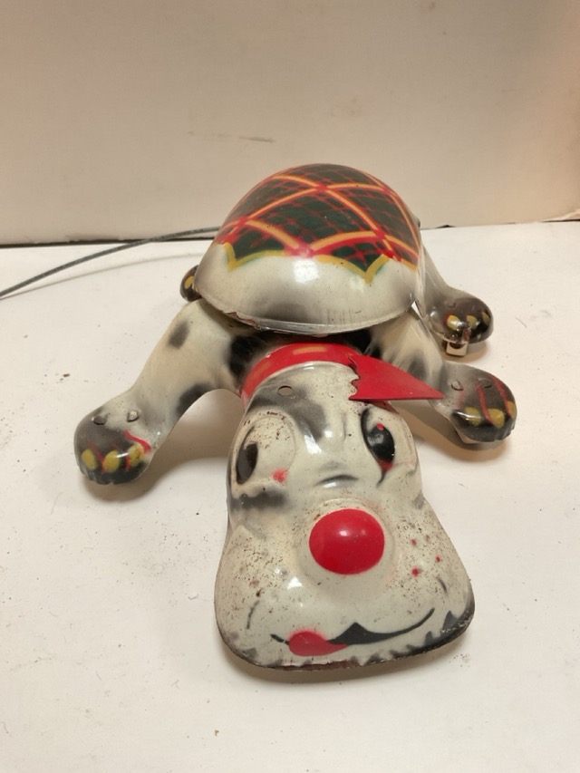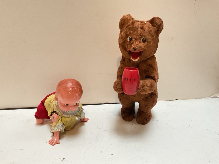 A 1960s Russian clockwork bear with jointed arms and mouth drinking honey; a 50s wind-up crawling baby by Irwin, in original card box; and a tinplate MOBO Scottie scampering dog toy, with squeeze handle. (3)