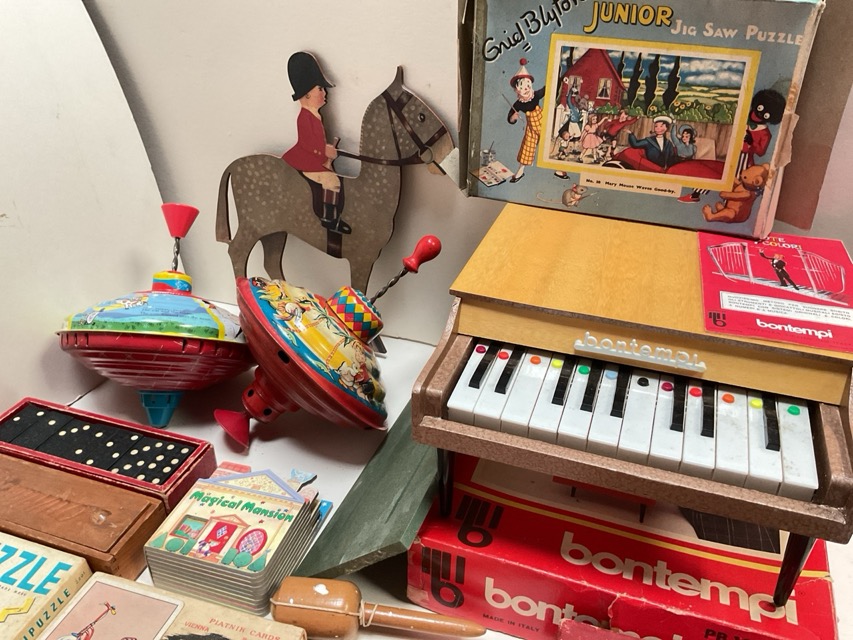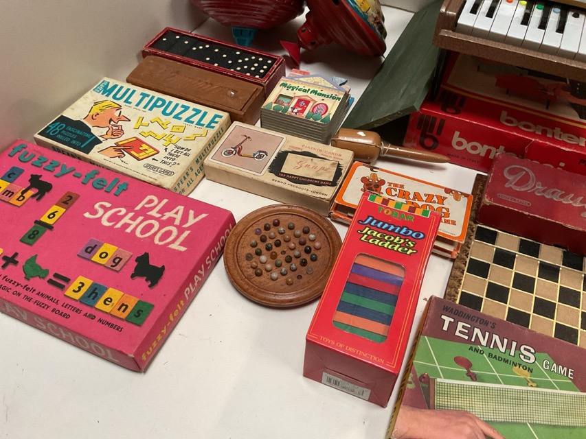 Miscellaneous boxed board games & toys - solitaire, draughts, a Bontempi piano, snap, dominos, spinning tops, an Enid Blyton jigsaw, board tennis & badminton, draughts, cup & ball, etc. (17)