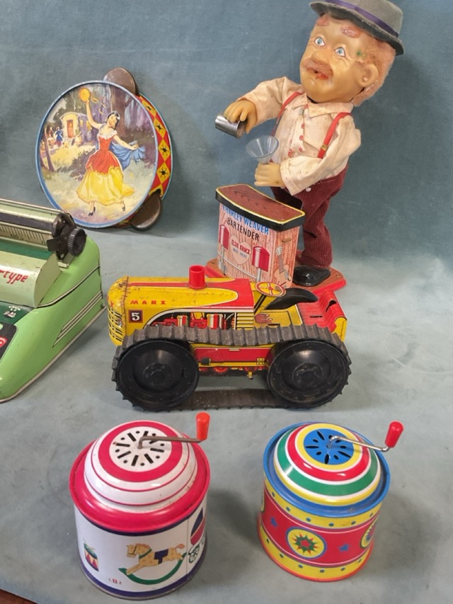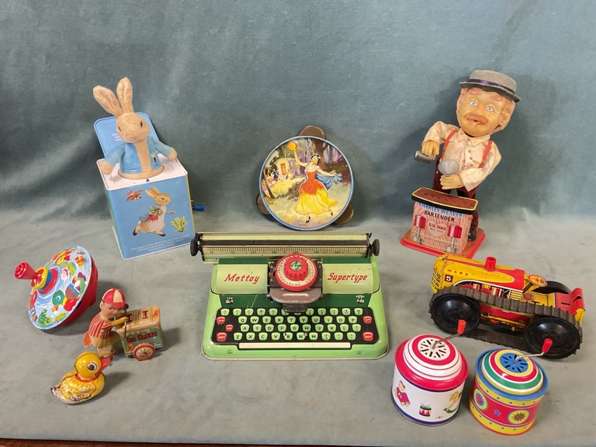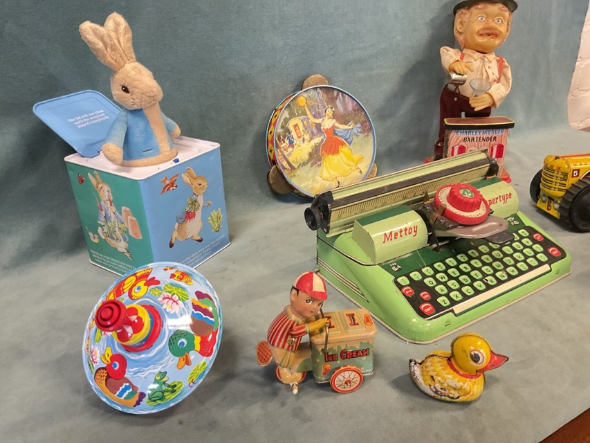 Miscellaneous tinplate toys - a Peter Rabbit jack-in-the-box, a tambourine, a Charley Weaver bartender automaton, a spinning top, a clockwork ice cream seller, a duck, a Mettoy typewriter, a Marx tractor, two hand-cranked musical boxes, etc. (10)
