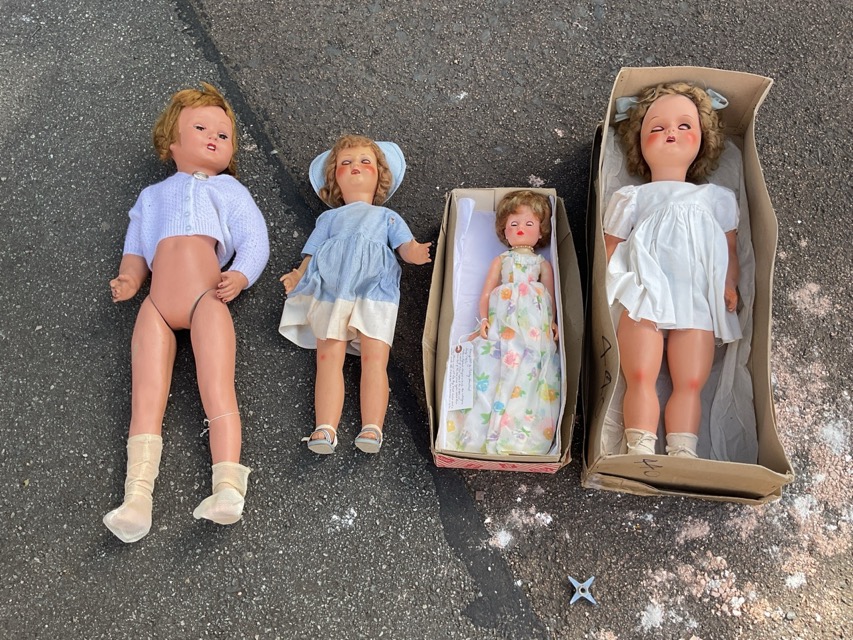 A large composition Roddy Doll with open mouth, mama box, sleep eyes and jointed limbs; a similar smaller walking doll with turning head action; a 60s Palitoy teenage doll in evening dress with original box; and a 30s Shirley Temple walking doll with original box. (4)