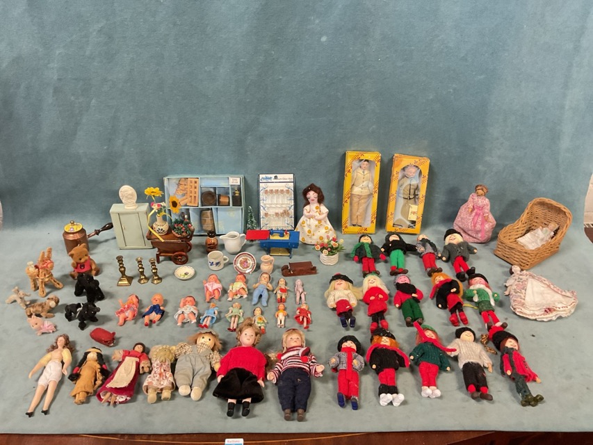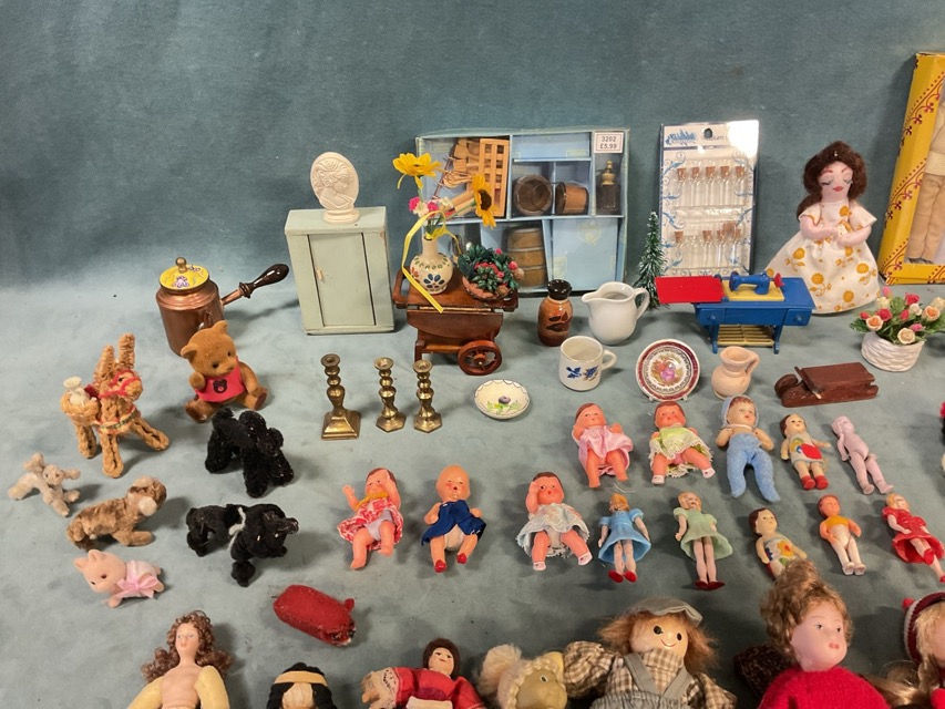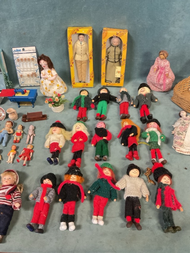 A collection of dolls house furniture, furnishings and dolls - a boxed set of kitchenalia, a set of glass jars, ceramics, brass candlesticks, a sewing machine, animal pets, peg dolls, handmade children in winter clothes, etc. (A lot)