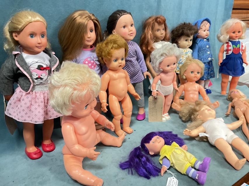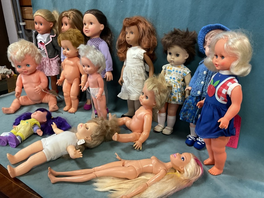 A collection of plastic and cloth bodied dolls - Battat Our Generation, Chad Valley Designa Friend, a 1955 Rosebud, a 1966 Kelly the Sunshine Girl, a 1978 Palitoy baby, a 16in Barbie with articulated torso and limbs, etc. (14)