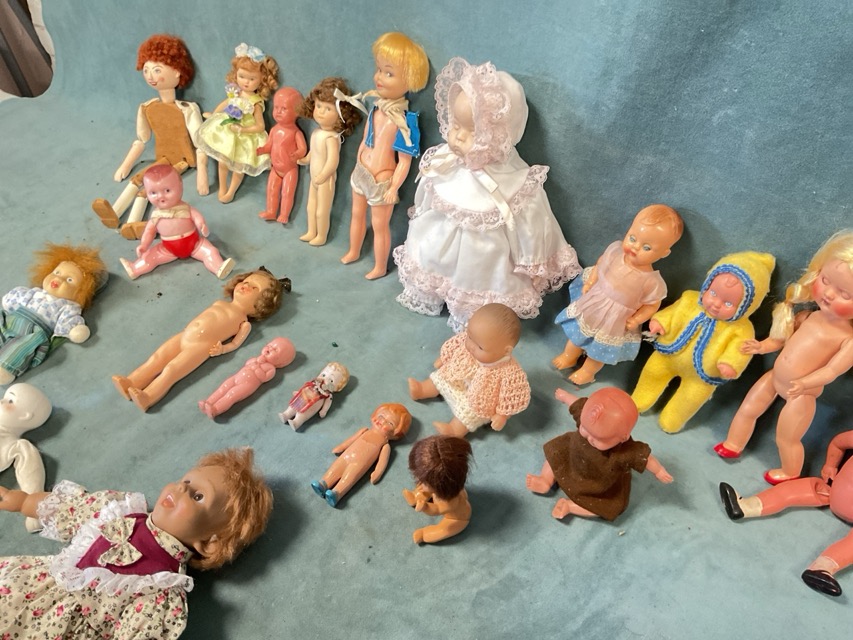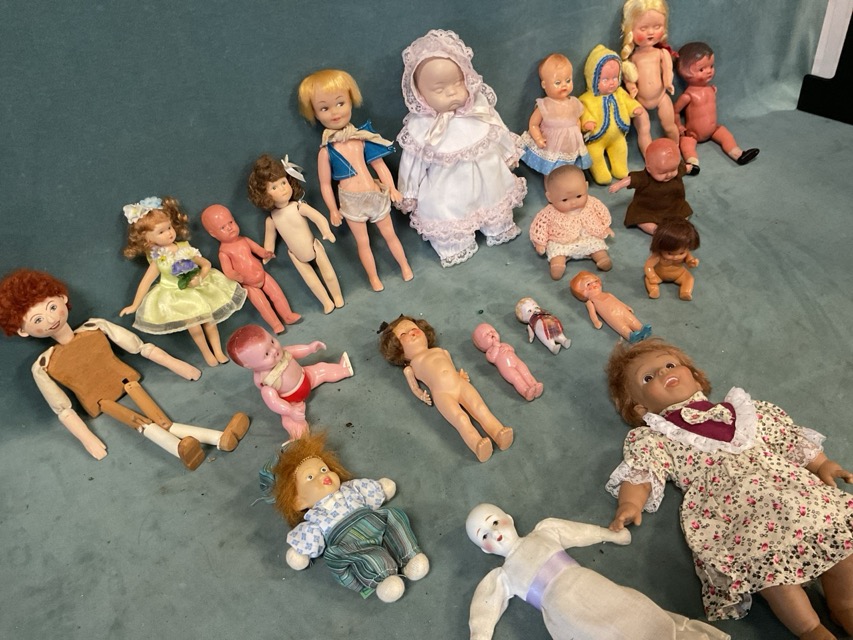 A collection of miniature dolls, 1930s-50s - porcelain, celluloid, plastic, vinyl, handmade wood, various makers including Simba, Sarold, Roddy, Rosebud, JC Toys, etc. (21)