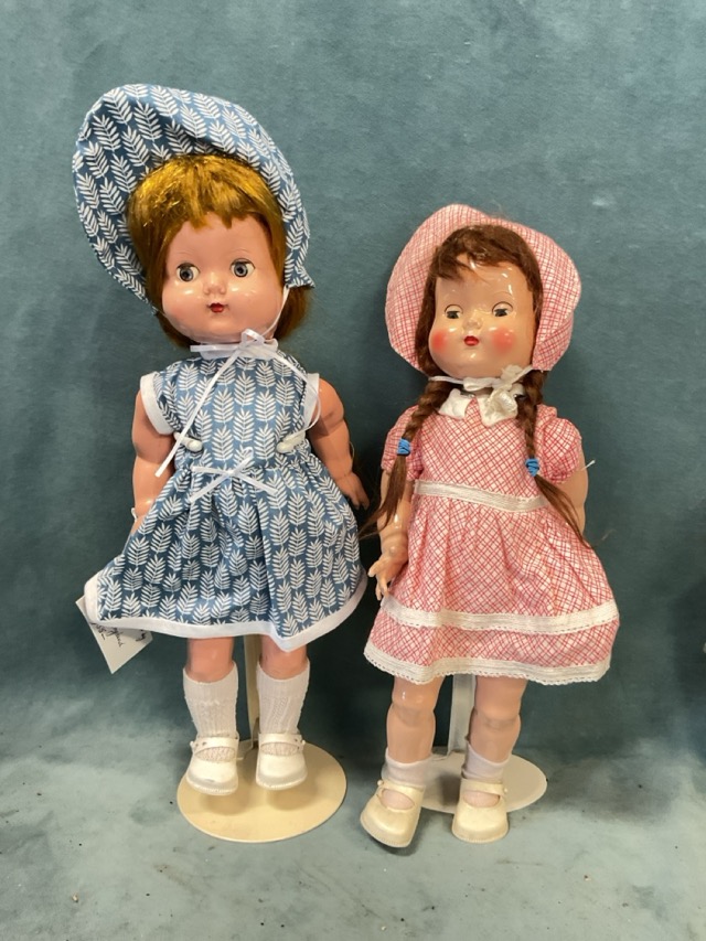 Two 50s Roddy walking dolls with original costumes; a boxed German cloth bodied doll with composition head; a 30s American Horsman Jane doll with original costume; a 40s BND London composition baby doll with sleep eyes and mama box; and another composition baby doll. (6)