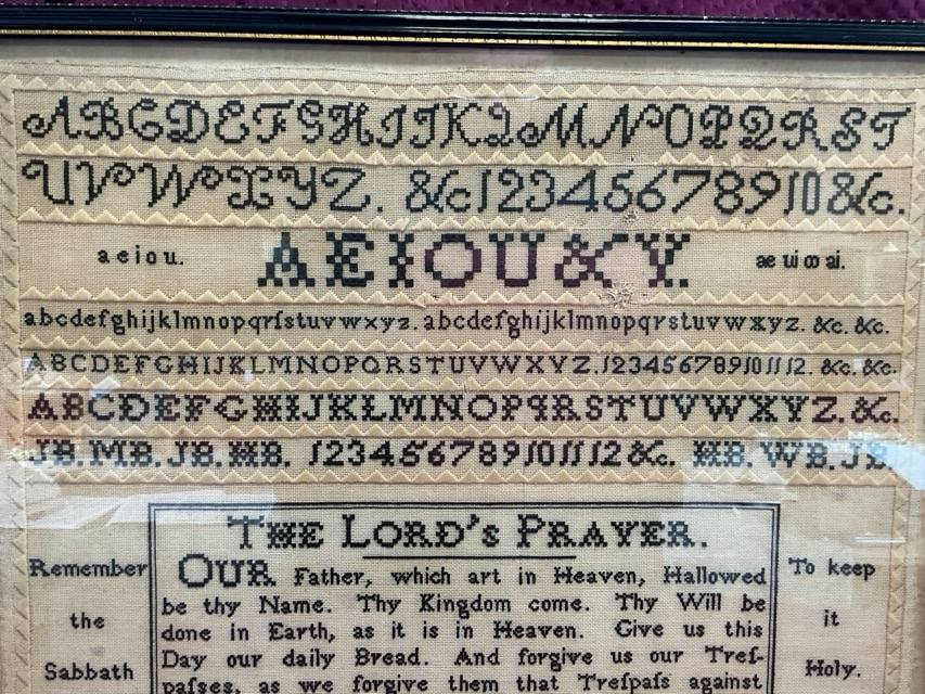 An 1854 sampler by Annis Bell from Wall, Northumberland aged 14, sewn in black wool with alphabet, numbers, vowels and prayer, laid down and hogarth framed. (18.75in x 16.75in)
