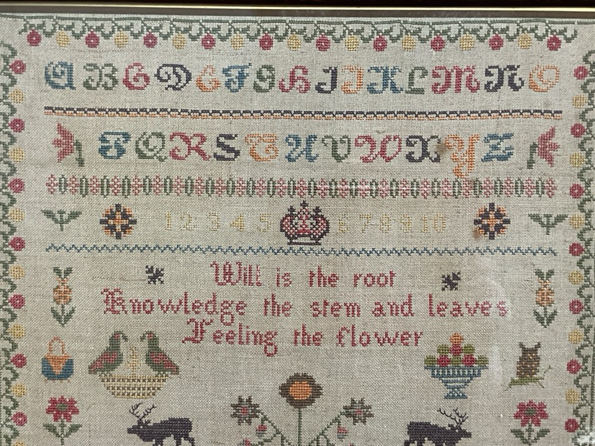 A colourful 1913 sampler sewn by Alice Corsley Snelgrove, with alphabet & numbers above motto with birds, butterflies, flowers, windmills, trees, deer, owls, etc., the panel framed by floral border, oak framed with gilt slip. (15.5in x 16.5in)