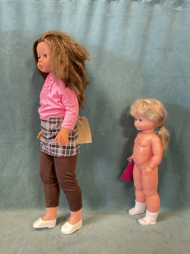 Five large dolls - a 36in Lotus with sleep eyes and jointed limbs, an 80s Spanish Famosa talking doll with pull cord voice box and jointed limbs, a pair of Pico cloth bodied twin dolls, and a realistic Famosa baby doll with cloth body. (5)