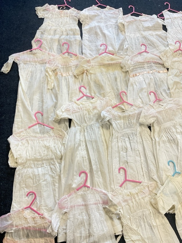 Twenty-three Edwardian and 20s young childrens fine white cotton and muslin dresses with lace, smocking, whitework embellishments, embroidery, etc. (23)