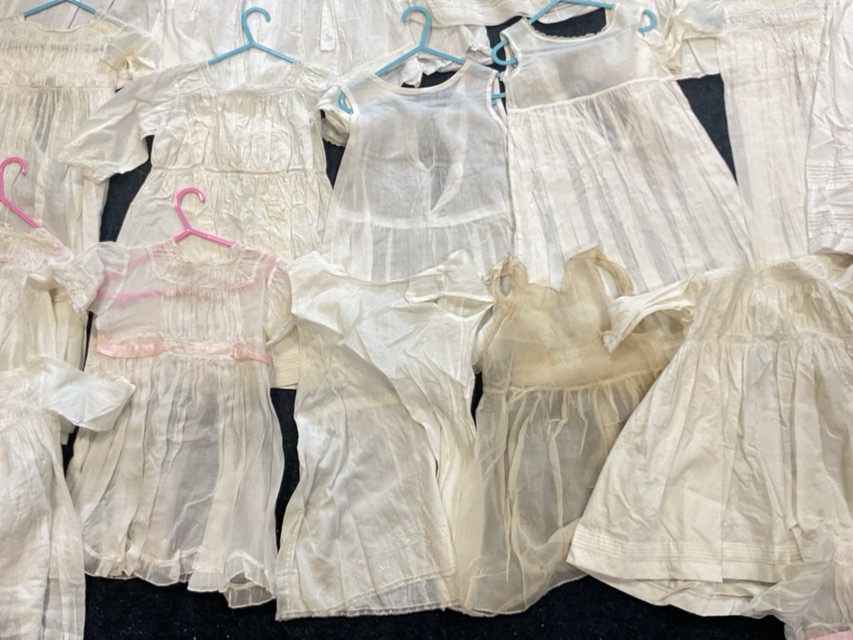Eighteen Edwardian, 20s and 30s young childrens fine white cotton and muslin dresses with lace, smocking, whitework embellishments, christening dresses, embroidered, etc. (18)