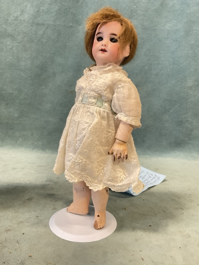 An German early C20th 11in bisque head American doll with open mouth, fixed eyes, and composition body with jointed limbs; and a 9in French bisque head doll by SFBJ with sleep eyes, open mouth, composition body with articulated limbs. (2)