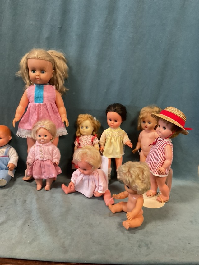 Twelve dolls with sleep eyes, original clothes and jointed limbs - Fisher Price babies, 50s & 60s Roddy & Palitoy type, a Teeny Tiny Tears, a stiff bodied Mattel with painted eyes, etc. (12)
