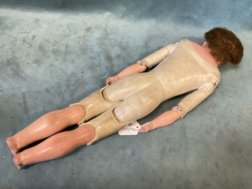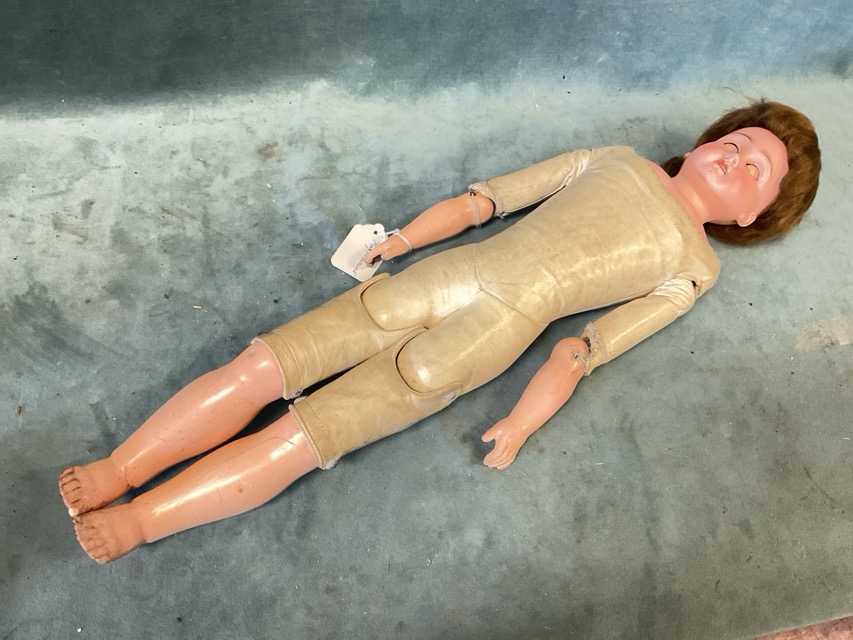 A Victorian 25in bisque head German doll by Cuno Otto & Dressel, with human hair wig, sleep eyes, open mouth, kid body, articulated limbs, and composition forearms and lower legs.