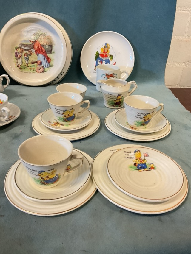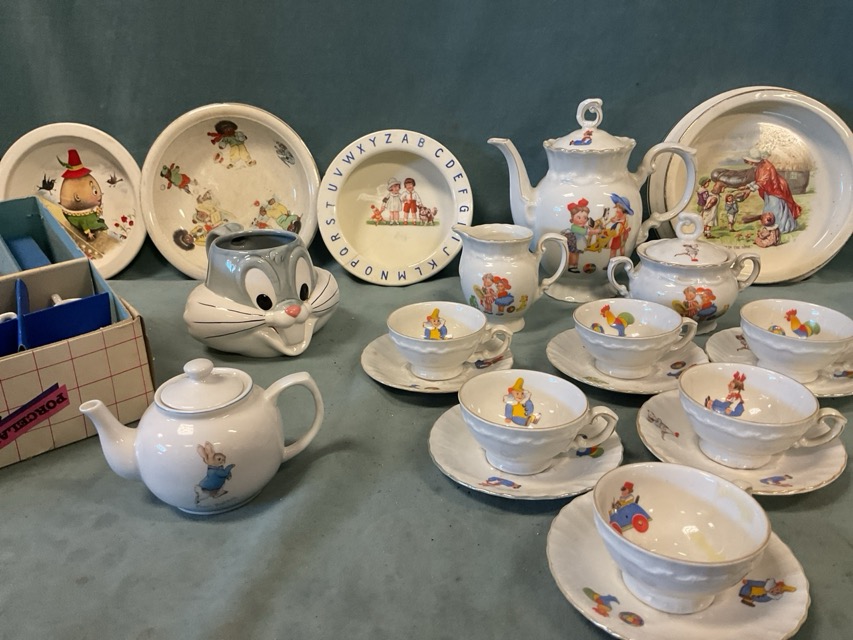 A collection of childrens ceramics - baby plates, a deco WWII childrens teaset decorated with chicks in uniform, a 30s Mitterteich Bavaria coffee service, a boxed porcelain teaset, a nursery rhyme mug & plate, a Bugs Bunny mug, a miniature Peter Rabbit teapot, etc. (A lot)