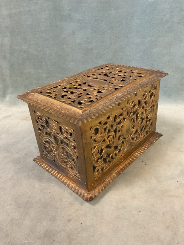 A rectangular brass casket with pierced foliate scrolled panels in gadrooned borders, having oval vacant cartouches, the interior with velvet lining. (9in)