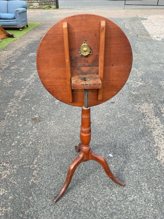 A nineteenth century mahogany snap-top circular occasional table with rise & fall mechanism to turned column, raised on tripod supports. (19in x 30in)