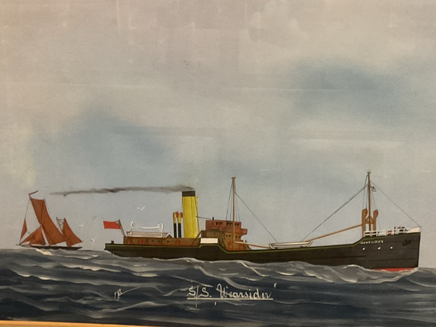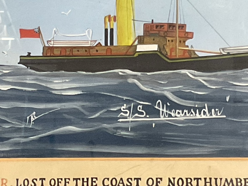 A 1925 watercolour, study of the steamship SS Wearsider with sailboats in background, in remembrance to crew members lost off Northumberland coast with all hands, mounted & gilt framed. (18.75in x 11.25in)