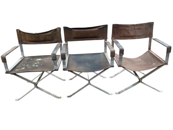A set of three modernist leather upholstered armchairs with rectangular chromed frames on crossed legs, the cantilevered arms with leather covered rests. (3)