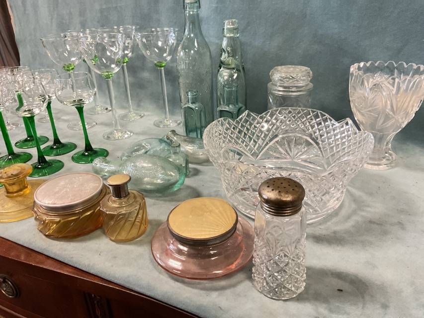 Miscellaneous glass - sets of glasses, a cut glass fruitbowl, five tall signed art glass wine goblets, dressing table pots, dug-up type bottles - torpedo, Stourbridge, Worcester, North Berwick, etc. (A lot)