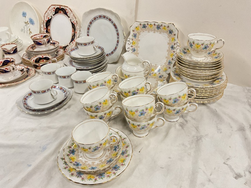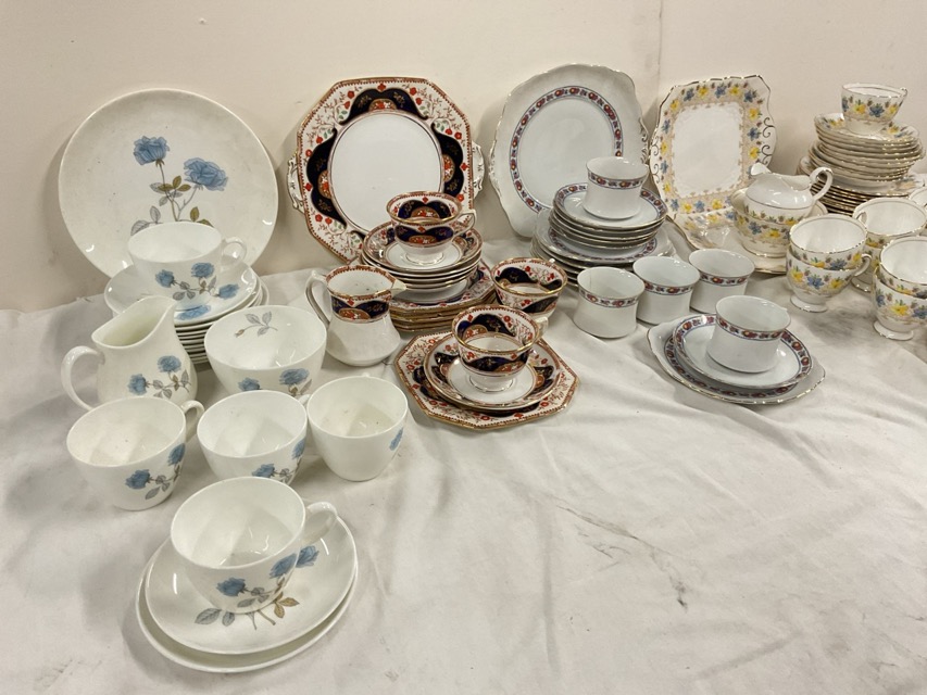 Four teasets - floral Tuscan china, poor mans derby Royal Stafford, foreign with floral friezes, and Wedgwood in the Ice Rose pattern. (4)